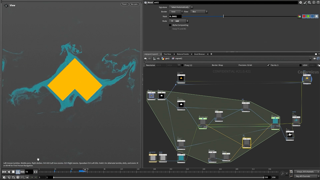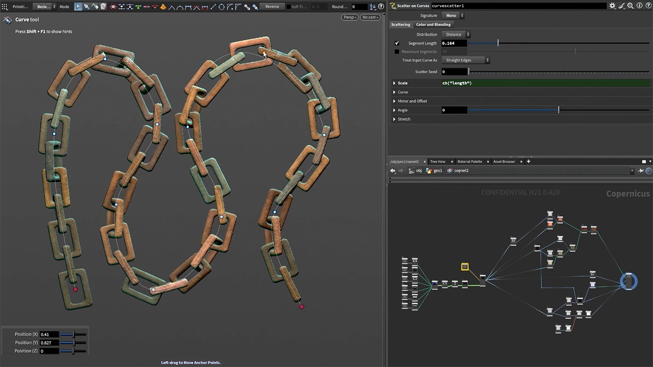 Copernicus は、テクスチャ生成において重要な役割を果たします。レイヤリング、散布、画像データ処理のための強力なツール群を備え、高ディテールでカスタマイズ可能なテクスチャを作成できます。スラップコンプにも対応しており、ライブフィルタの適用やテクスチャの統合を行いながら、ワークフロー内で直接、コンポジット結果をプレビューできます。