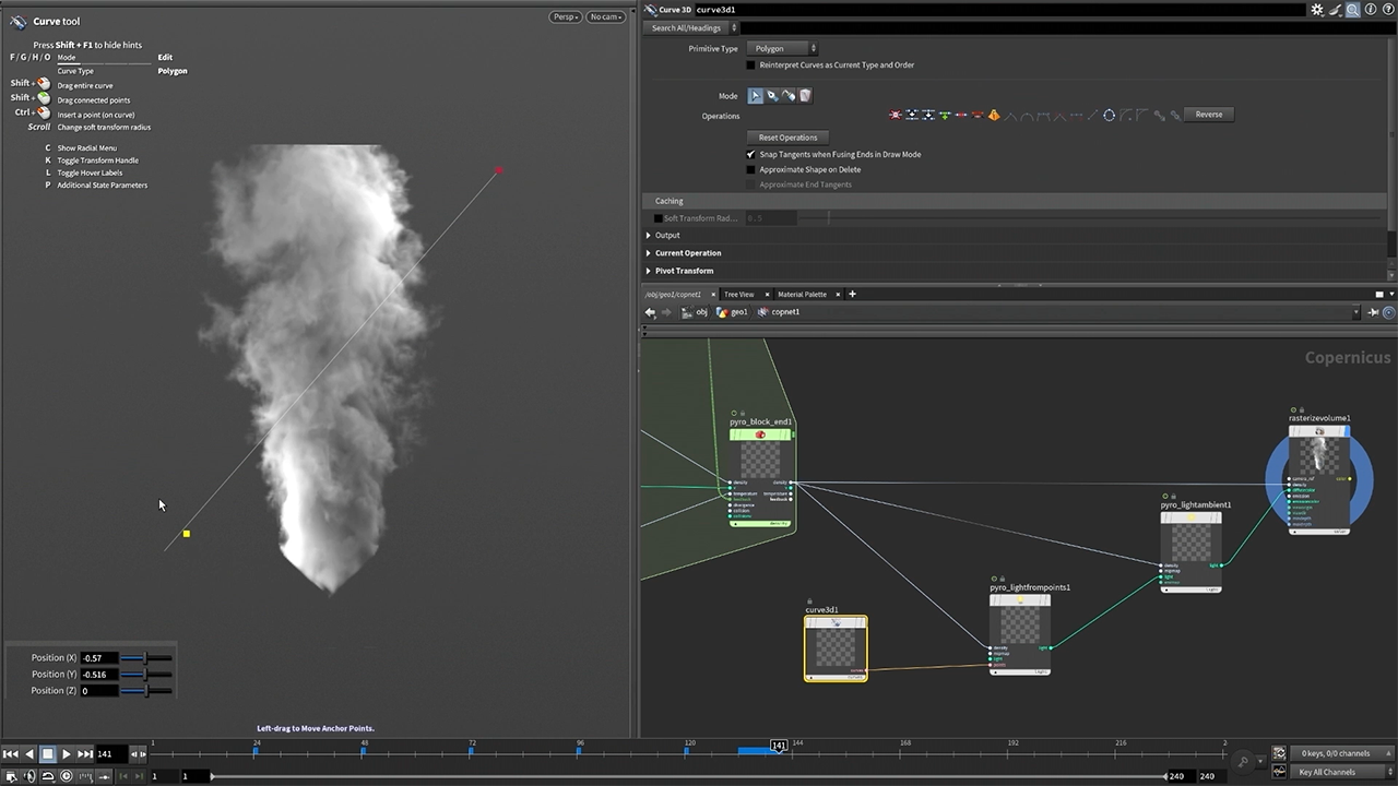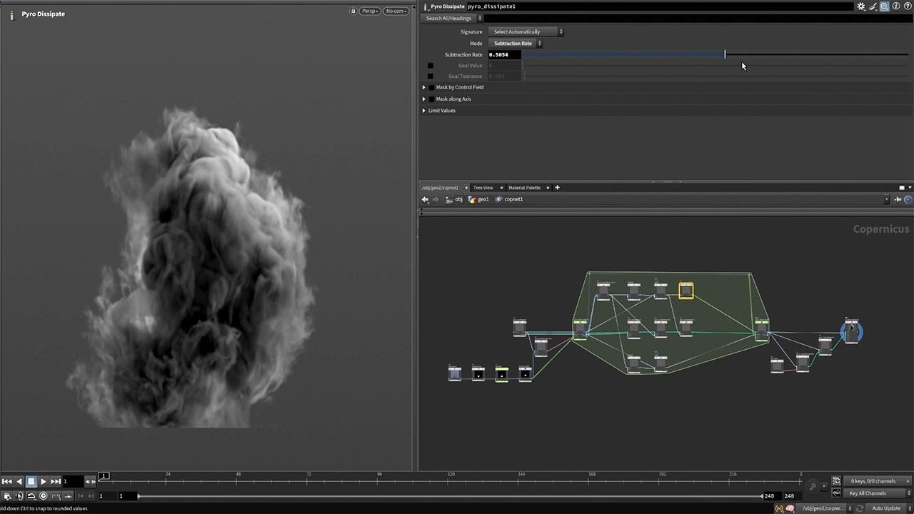Copernicus 内で Pyro FX を扱えることで、 VFX アーティストは、 GPU アクセラレーションによるリアルタイム処理で、煙、炎、爆発といったボリュメトリックエフェクトを作成、調整できます。2D/3D のハイブリッド環境で作業できるため、ボリュームを素早くラスタライズしてディテールに富む画像を生成し、高速な変形やライティング、エフェクトの適用が可能です。