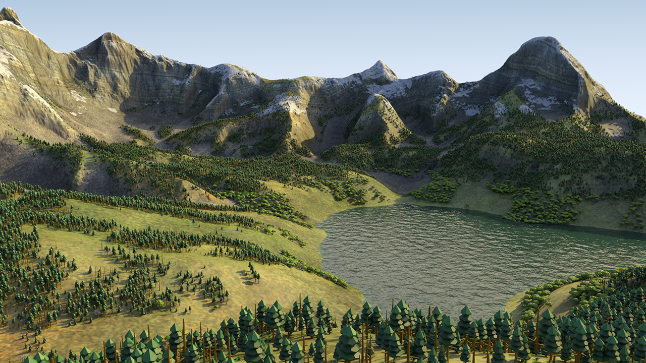柔軟性とアーティスティックなコントロールを実現するために構築されたパワフルな地形システムを使って、魅力的な風景を作りましょう。プロシージャルノイズやマスク、ペイントツールを活用すれば、画像コンポジットの経験者ならすぐに馴染めるワークフローによって、地形をレイヤー化し、スカルプトできます。生成した地形は、Height Fields をジオメトリに変換せずともそのまま、流体、群衆エージェント、パーティクル、破壊、Pyro FX との相互作用が可能です。